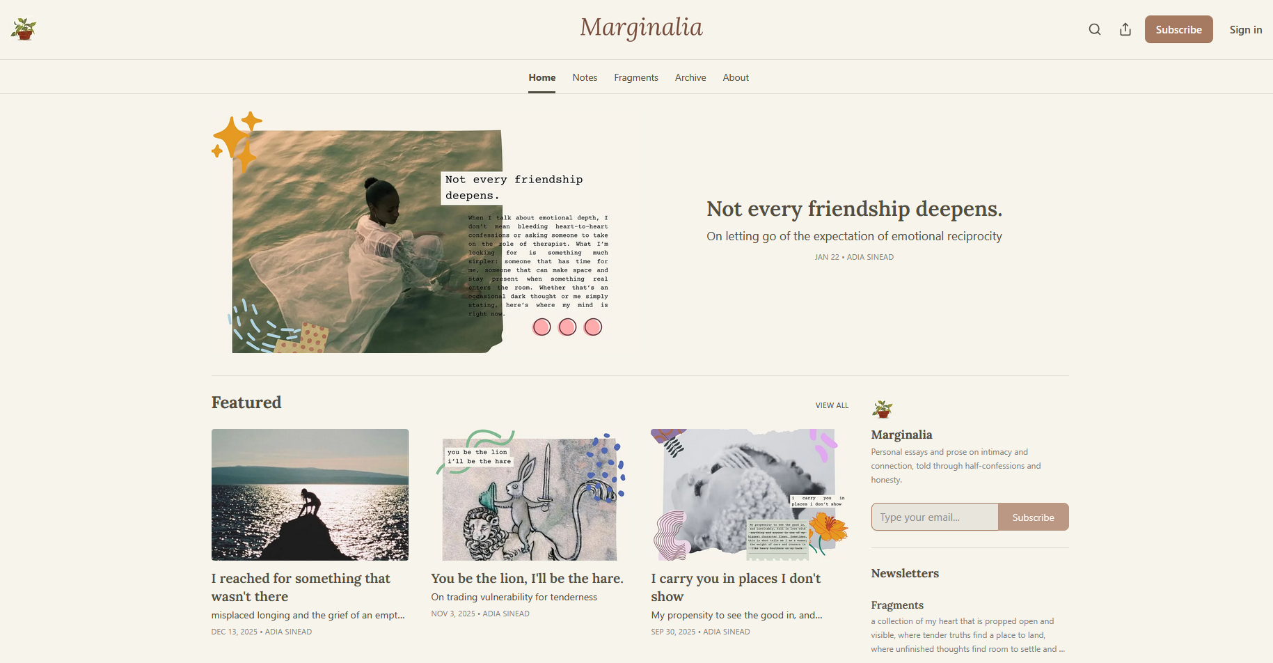 My writing lives primarily in Marginalia, where I publish reflective essays and notes on intimacy, connection, slowness, and the quiet truths we often move past too quickly. The work is personal but not performative, thoughtful without urgency—an ongoing practice of making sense of experience and offering language for what’s felt but not always named.