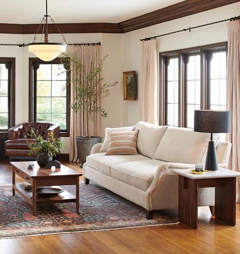 The dark wood paneling we have in our living room in my opinion should be celebrated! We know it is real wood and it’d be a shame to pull it all down. Since it’s just a feature of one space, we want to bring it up to date by painting it a lighter color, like a cream or off-white tone.