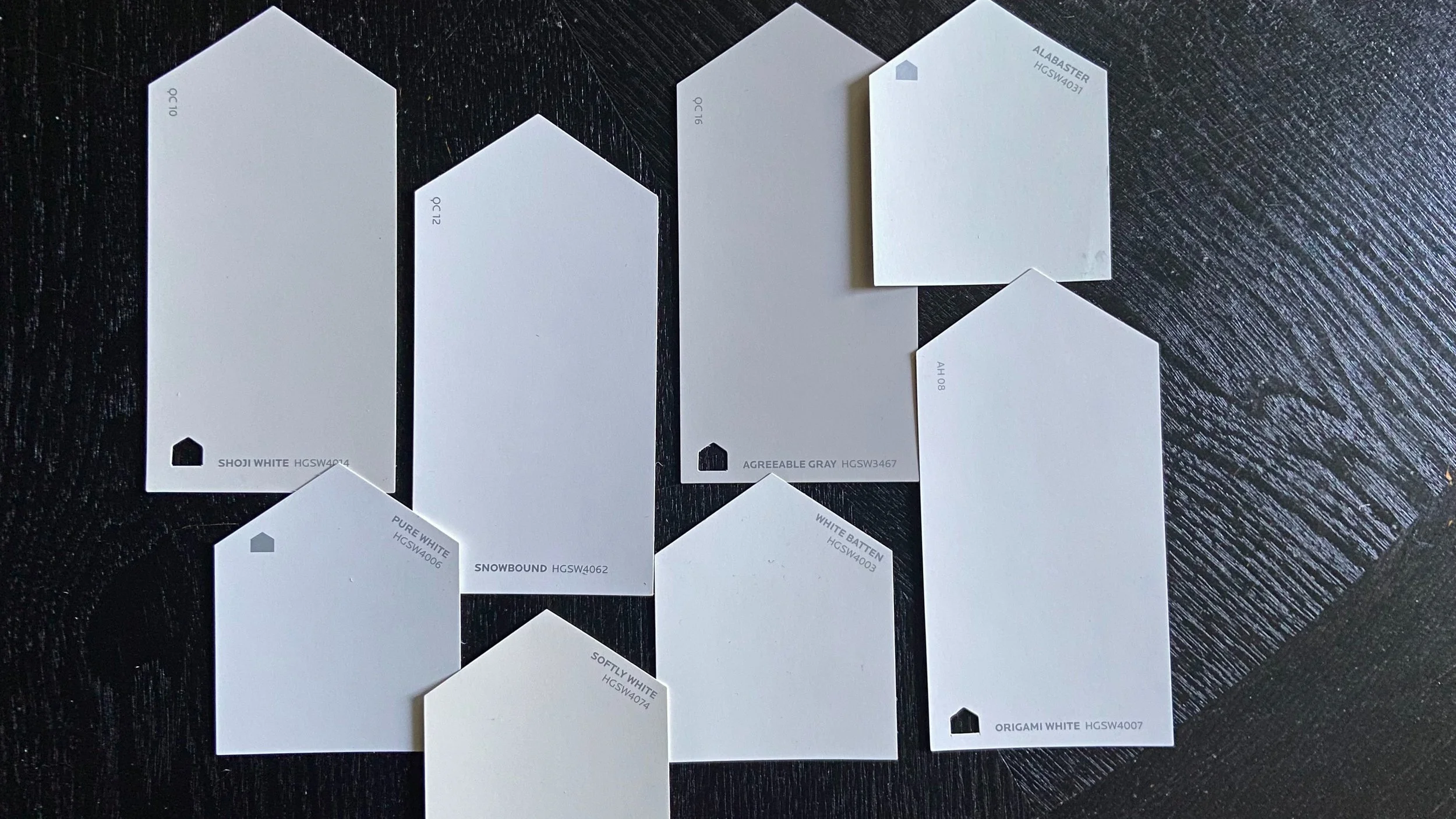 I went over to Lowe’s and picked up a ton of swatches of white, then narrowed it down to 8 favorites. Once we’ve done a few other things in the house, we’ll pick a few shades and do some test swatches on the walls.