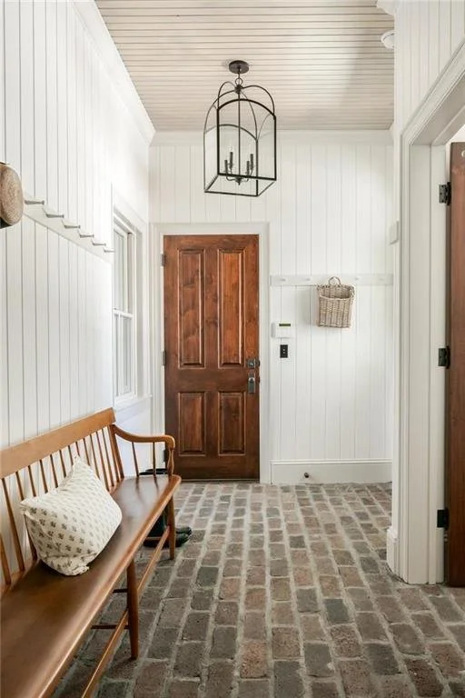 Sherwin Williams White Batten paneling with wood accents and contrast trim. (Hooked on Houses)